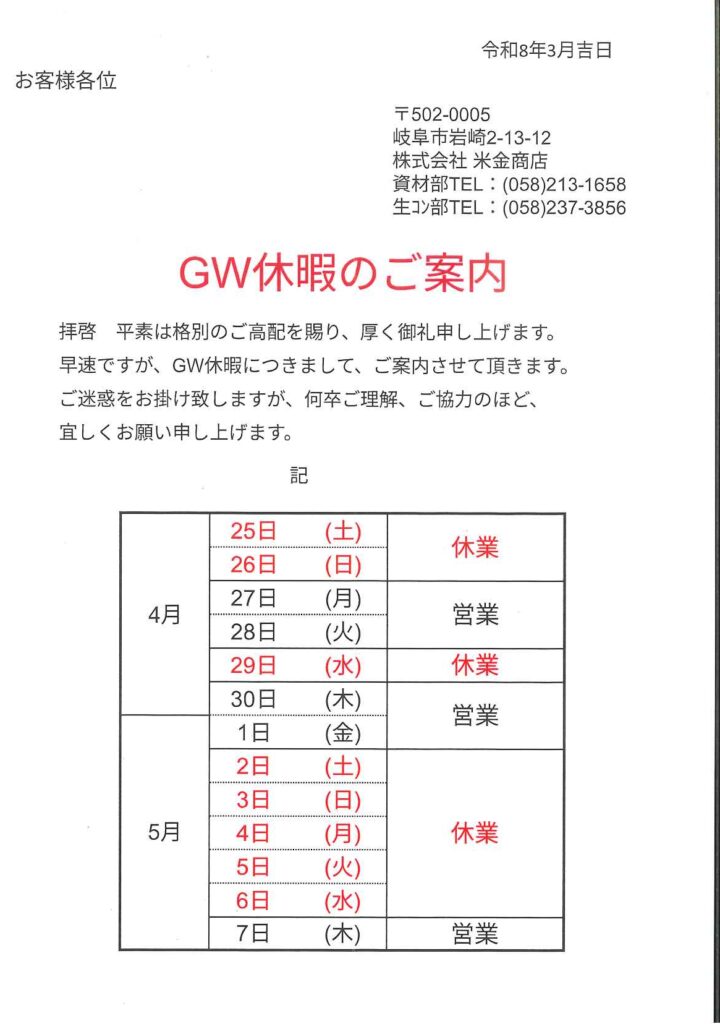 本日はゴールデンウィークのご案内です。休業中はご迷惑をおかけしますがよろしくお願いいたします。